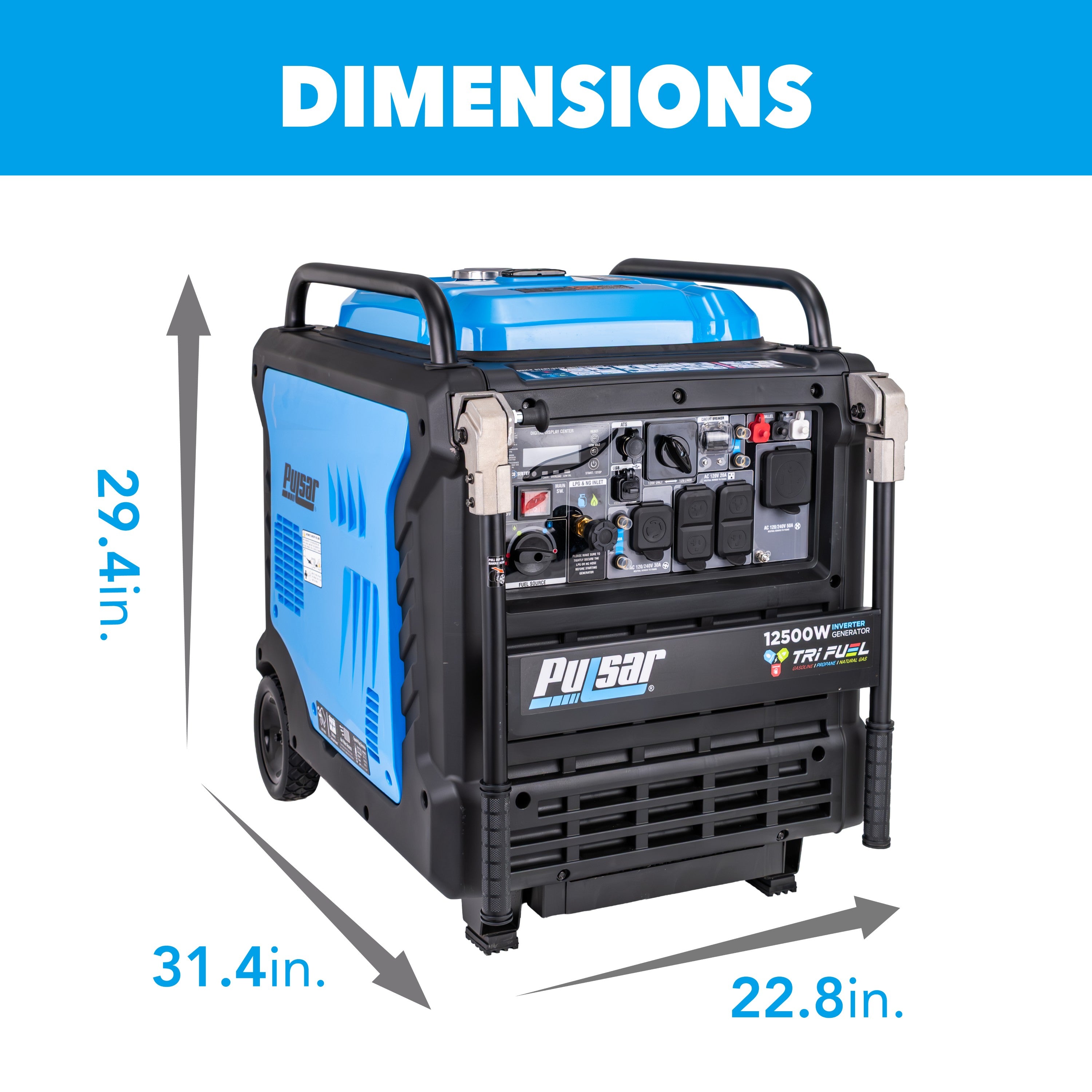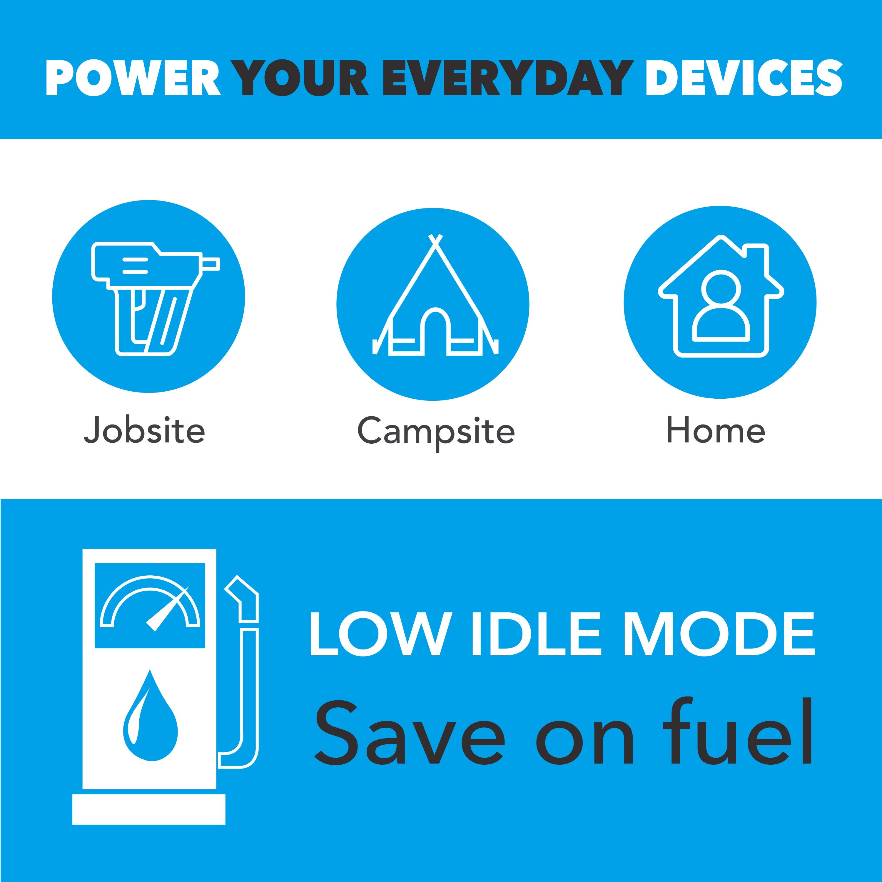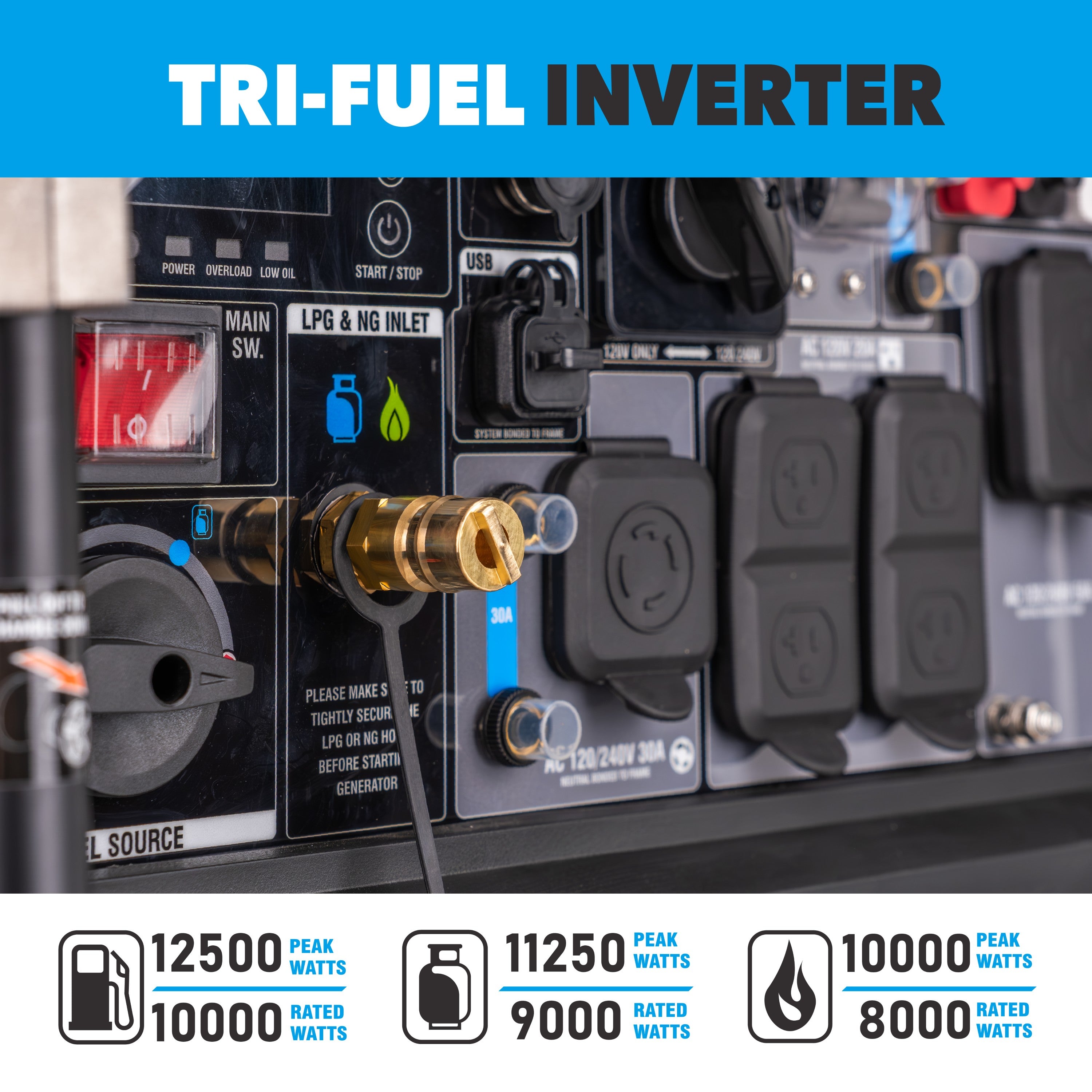 • Tri Fuel Operation: Runs on gasoline, propane, or natural gas for maximum flexibility